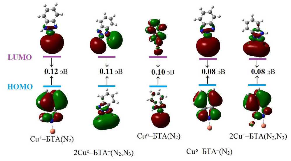 В работах [97, 98] для изучения взаимодействия бензотриазола с поверхностью меди использовали SERS (Surface-enhanced Raman spectroscopy or surface-enhanced Raman scattering – это поверхностно-чувствительный метод, который усиливает комбинационное рассеяние света молекулами, адсорбированными на шероховатых металлических поверхностях). Авторы предложили модель строения поверхностного комплекса Cu(I)–БТА, в которой электроны 5- и 6-членных колец БТА полностью делокализованы, а атомы N2 и N3 эквивалентны. В данных работах объяснено образование химической связи N→Cu путем перекрывания sp-гибридной атомной орбитали меди с негибридизованными атомными орбиталями азота молекулы БТА.