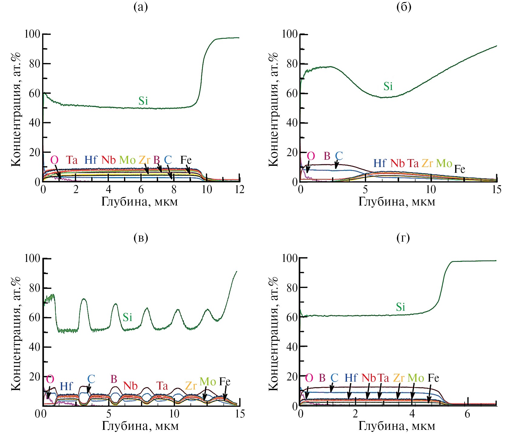 Типичные элементные профили покрытий представлены на рис. 2. Исследования методом ОЭСТР показали, что SL покрытие содержит, ат.%: 51 Si, 7 B, 7 Zr, 7 Nb, 8 Mo, 10 Ta, 10 Nb. В покрытиях были обнаружены незначительные примеси кислорода и железа. Металлические примеси можно объяснить натиранием материала размольных тел в процессе изготовления мишени для распыления [52, 53]. Все элементы были равномерно распределены по толщине покрытий. Близкий состав имел нижний слой в двухслойном покрытии DL. Верхний слой DL покрытия содержал, ат.%: 78 Si, 13 B, 9 C. Таким образом, на поверхности DL покрытия достигалась повышенная концентрация кремния. Слои в ML покрытиях имели состав близкий к составу соответствующих слоев в DL покрытиях. NC покрытия имели следующий состав. ат.%: 61 Si, 12 B, 9 C, 3 Zr, 3 Nb, 3 Mo, 4 Ta, 5 Hf. По сравнению с базовым SL покрытием наблюдался рост концентрации кремния на 10 ат.% и бора на 5 ат.% при общем снижении концентраций металлов.