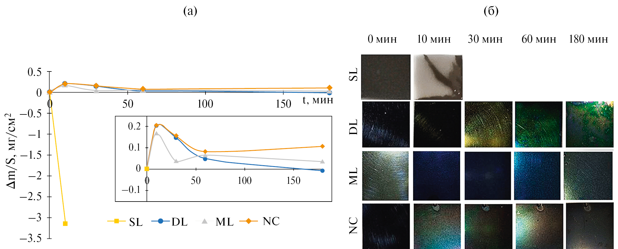 Результаты изотермических отжигов при 1000°С показали, что для SL покрытия наблюдалось резкое снижение Δm/S до 3.1 мг/см2 при выдержке в течение 10 мин (рис. 3а), что связано с отслоением покрытия (рис. 3б) вследствие его низкой адгезионной прочности и трещиностойкости, а также возможных структурных превращений, сопровождающихся изменением объема фазовых составляющих [45]. В случае DL-, ML-, NC-покрытий внешний вид образцов после различных временных выдержек менялся незначительно, выраженных отслоений, вспучиваний, трещин и других дефектов на поверхности заметно не было. Закономерности изменения параметра Δm/S от времени выдержки для покрытий DL, ML, NC были близкими (рис. 3а). Рост Δm/S до 0.15–0.21 мг/см2 в течение 10 мин связан с образованием на поверхности этих покрытия плотной защитной оксидной пленки. При последующих нагревах и выдержках данная пленка препятствует интенсивному окислению покрытий. При выдержках в диапазоне от 60 до 180 мин параметр либо снижался (Ml, DL), либо оставался стабильным (NC).