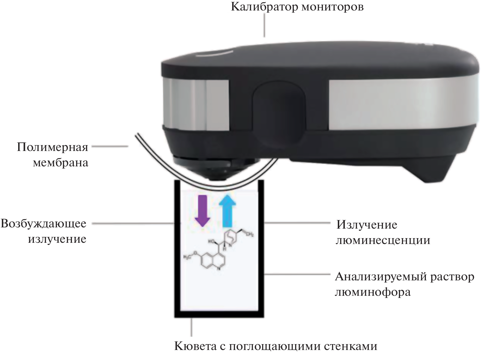 A possibility of using a monitor calibrator for the determination of luminescent compounds is shown on an example of quinine. The determination is based on the irradiation of a sample with broadband radiation in the visible and near UV spectral regions from a built-in source exciting phosphor molecules and the simultaneous registration of the radiation incident on the detector. Measurement conditions are selected. Quinine can be determined in the range of 60−750 µM, the limit of detection is 20 µM. The determination is not affected by common inorganic ions, as well as sweeteners and acidity regulators present in many beverages. The developed method of determination is applicable to the analysis of carbonated drinks and drugs. Compared to a traditional spectrofluorimeter, monitor calibrator is characterized by compactness, mobility, ability of detecting luminescence in cuvettes of various sizes and shapes, and lower cost.