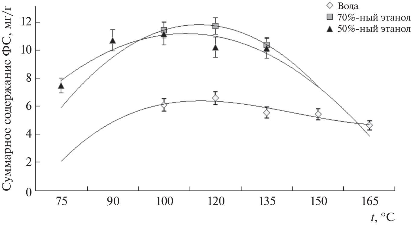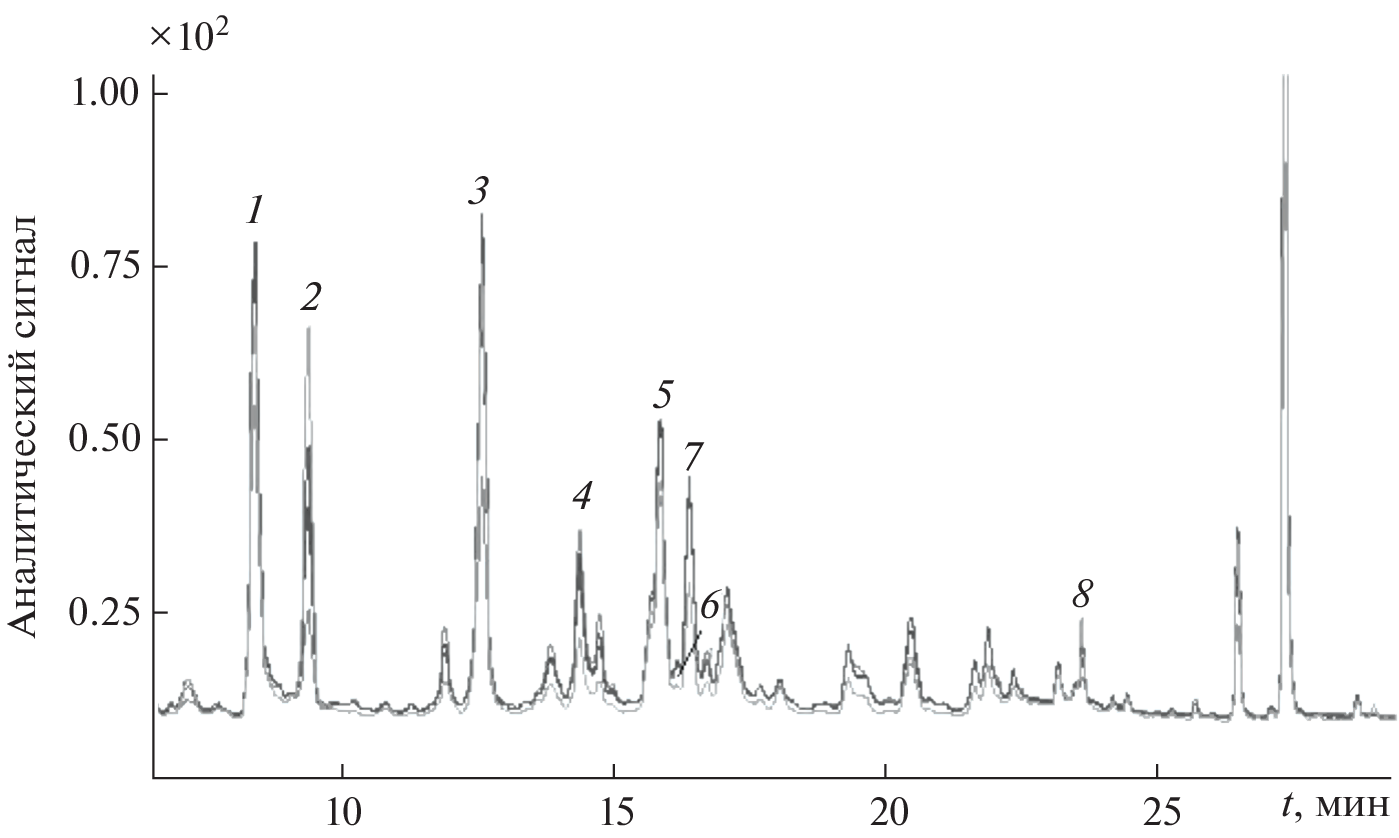 Обсуждаются результаты исследования водных и водно-спиртовых экстрактов фенольных соединений ромашки аптечной (Matricаria chamomilla L.) в зависимости от условий их извлечения различными способами. Объект исследований – собранная в различных регионах России ромашка аптечная. Фенольные компоненты в их нативных формах извлекали из лекарственного сырья различными способами: настаиванием, мацерацией, микроволновым, ультразвуковым, субкритическим и фармакопейным. Содержания индивидуальных компонентов и суммарное содержание фенольных соединений в экстрактах ромашки аптечной оценивали хроматографическими методами. ВЭЖХ-определение фенольных соединений с диодно-матричным и масс-спектрометрическим детектированием проводили в градиентном режиме элюирования смесью ацетонитрил–0.1%-ная муравьиная кислота. В водных и водно-спиртовых экстрактах ромашки аптечной идентифицировали хлорогеновую кислоту, гликозиды феруловой кислоты, лютеолин-7-О-глюкозид, дикофеилхинную и цикориевую кислоты, апигенин-7-глюкозид, апигенин. По содержаниям фенольных соединений в экстрактах цветов ромашки различных производителей с различных территорий изучили зависимость данного показателя от географического места произрастания растительного сырья. Максимальное суммарное содержание фенольных соединений (10.1 мг/г) наблюдали в экстракте ромашки аптечной торговой марки “Фармацвет” (Московская обл., Красногорск).