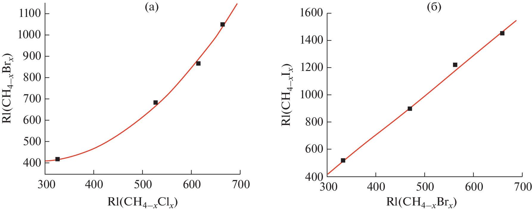 = RIn + 1 – RIn (equivalent to the first derivatives of the retention indices with respect to the structural parameter varied in the group), are the conditions of correctness for such correlations in the simplest groups (substituted methanes). A monotonic variation of