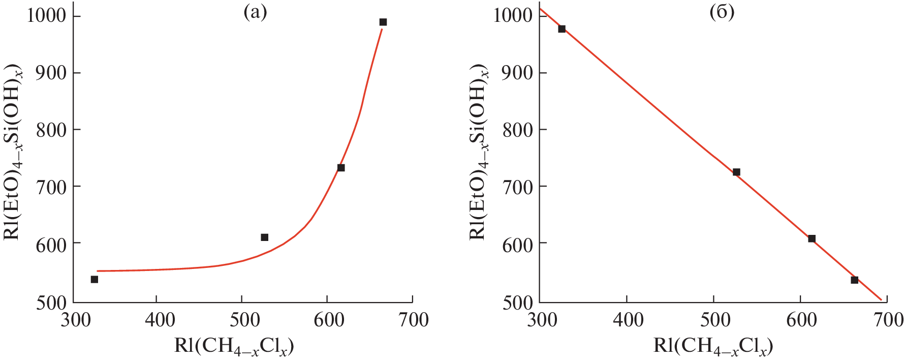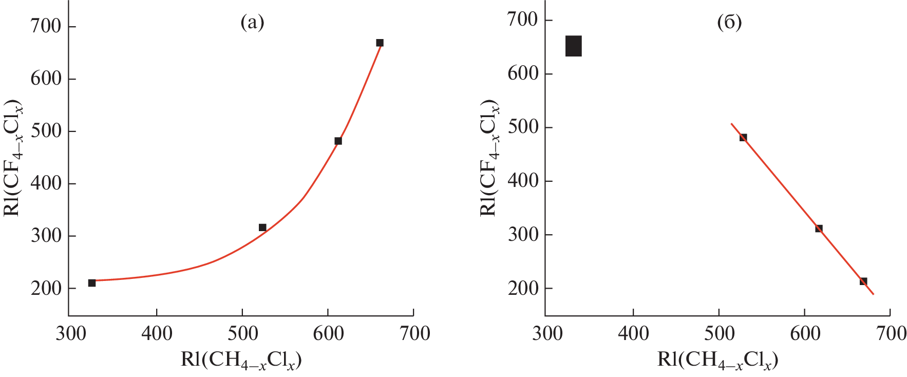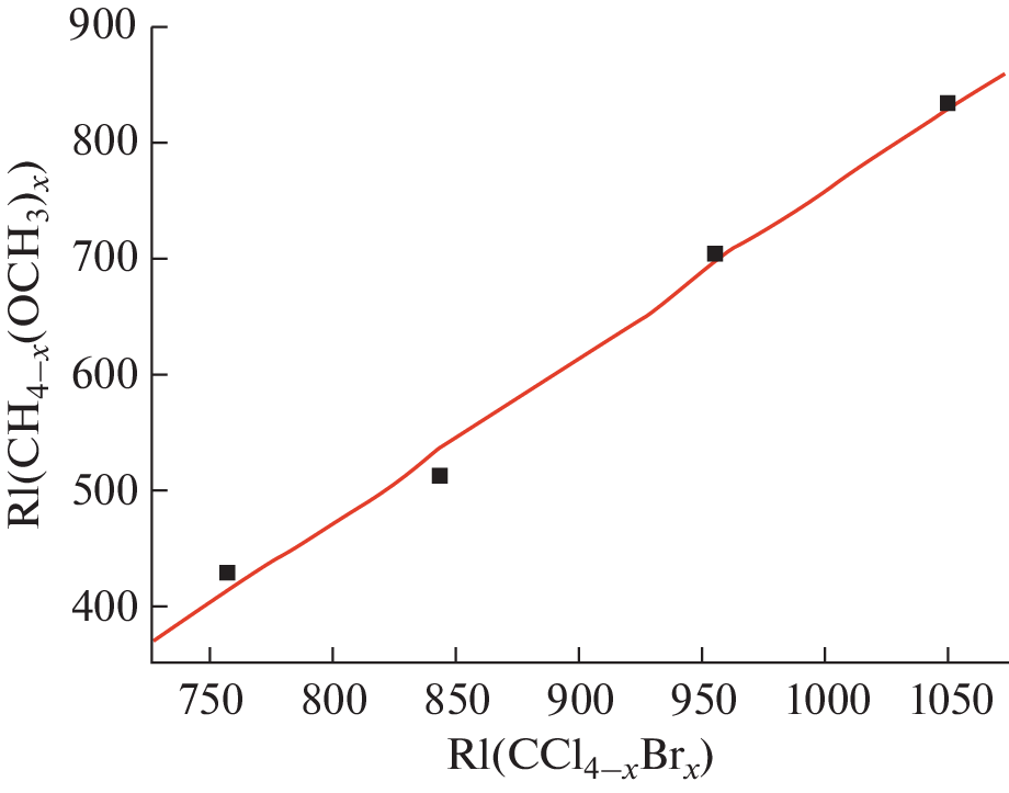 in one of the groups with the presence of extrema in the other group is an unequivocal sign of the absence of a linear correlation between retention indices. If the values of