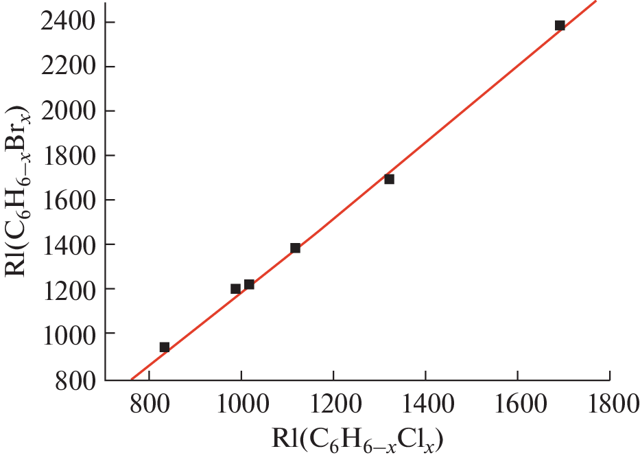 in one of the groups increase and decrease in the other, the ranking order of compounds in any one of them should be reversed. It is shown that the simplest relationship RI1 ≈ aRI2 + b is also applicable to more complex taxonomic groups (substituted ethanes, benzenes, and naphthalenes), and it allows one not only to estimate the RIs of compounds not yet characterized but also to refine known reference data.