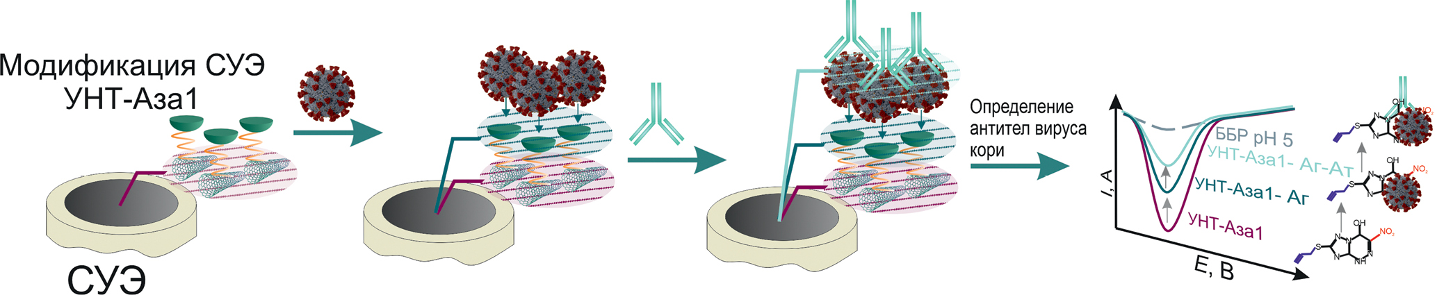 Реактивы. 1-Этил-3-(3-диметиламинопропил)карбодиимид (ЭДК) (≥97%), N-гидроксисукцинимид (НГС) (≥97%), аминоэтантиол (99%), диметилсульфоксид (ДМСО) (99.5%), азобисизобутиронитрил (АИБН) (99%), карбоксилированные многостенные углеродные нанотрубки (УНТ) (≥98%), хлорид калия (≥99%), гексацианоферрат калия(II) и гексацианоферрат калия (III) (≥99%) приобретали у фирмы Sigma-Aldrich (США). Использовали следующие коммерческие реактивы: фосфорную кислоту (85%) (Prayon, Бельгия), борную кислоту (99.9%) (“Реахим”, Россия), ледяную уксусную кислоту (99.8%) (завод ПКС, Россия), коревой антиген NovO/96 в концентрации 2,33 мг/мл (“Вектор”, Россия) и антитела к кори (“Вектор”, Россия).