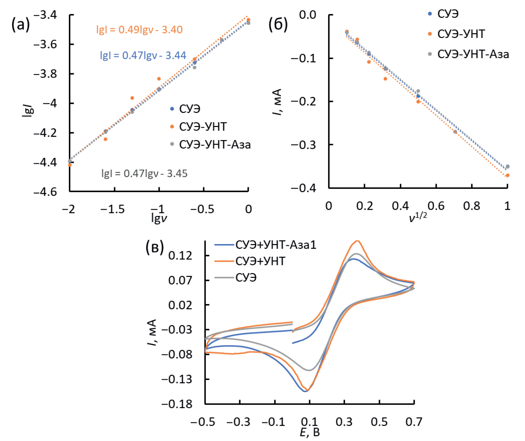Поверхность модифицированных электродов характеризовали методом циклической вольтамперометрии (ЦВА) (рис. 5). Критерий Семерано, рассчитанный из логарифмической зависимости величины тока, зарегистрированного в системе ферри/ферроцианид-ионов, от скорости наложения потенциала (tgα = lgI / lgν) для СУЭ, СУЭ-УНТ, СУЭ-УНТ-Аза1 составил соответственно 0.47, 0.49, 0.47, что свидетельствует о диффузионной природе тока [12].