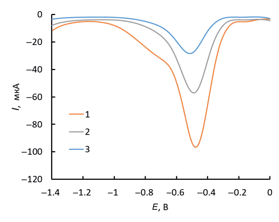 Рис. 7. Квадратно-волновые вольтамперограммы, зарегистрированные на СУЭ-УНТ-Аза1 до (1) и после инкубации в модельной суспензии антигена (10–3 г/л) (2); антигена и антител к вирусу кори (5 МЕ/мл) (3), фоновый электролит буферный раствор Бриттона–Робинсона, pH 5