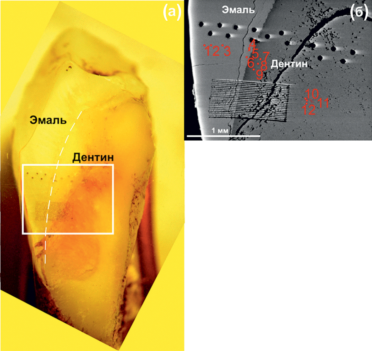 Перед анализом поверхность образца зуба, смонтированного в шашку, обрабатывали 0.5 н HNO3 (3 мас. %) для удаления загрязнений.
