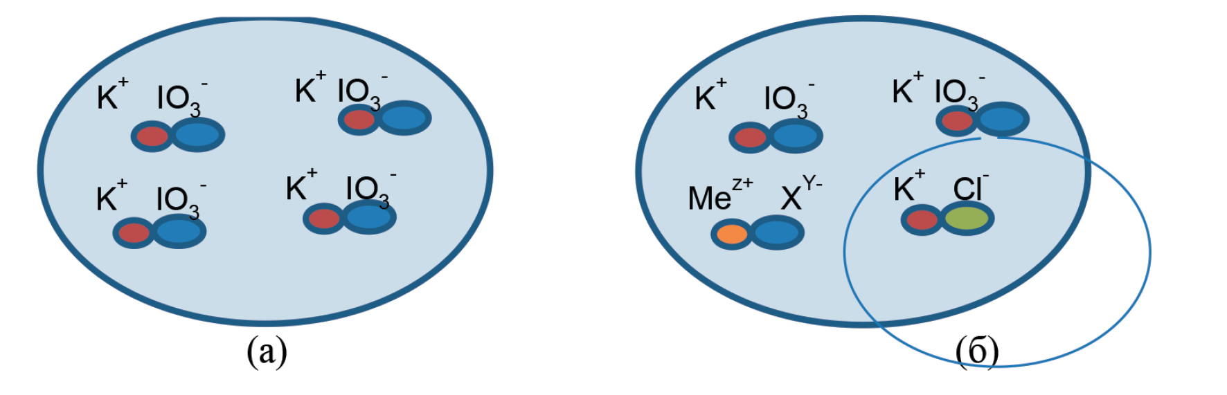 Далее в соответствии с моделью химического состава йодата калия избыток содержания ионов калия в анализируемом объекте определяли на основе уравнения электронейтральности по формуле