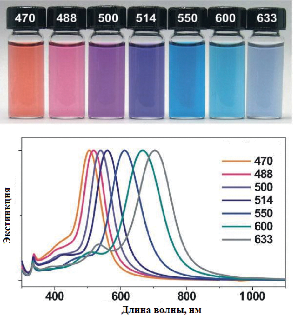 Рис. 3. Оптические спектры поглощения и соответствующие им растворы треугольных нанопластинок серебра с различной длиной ребра. Числа на крышках флаконов и спектрах соответствуют длине волны облучения (нм), которое было использовано для получения данных наночастиц [32]