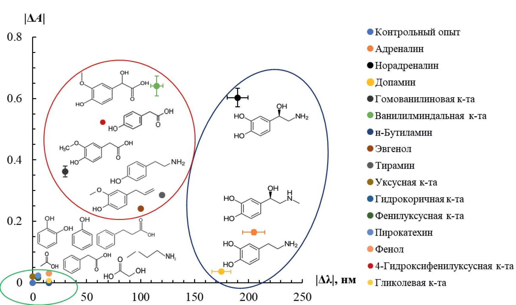 Определение веществ, вызывающих агрегацию наночастиц. Процессы агрегации металлических наночастиц лежат в основе классического варианта детектирования аналитов, связывающихся с поверхностью металла и меняющих коллоидную стабильность системы [44]. К таким аналитам относят тиосоединения, образующие прочную связь с поверхностными атомами золота и серебра. Наличие тех или иных функциональных групп в составе аналита может существенно влиять на поверхностный заряд наночастиц и, следовательно, на аналитические характеристики способа определения.