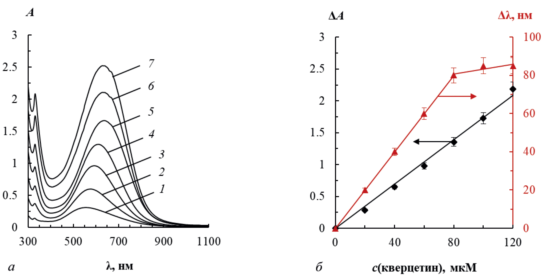 Рис. 9. а): Спектры поглощения треугольных нанопластинок серебра до (1) и после (2–7) взаимодействия с кверцетином в присутствии нитрата серебра(I); б): зависимости ΔA и Δλ от концентрации кверцетина, соответствующие приведенным спектрам поглощения. c(кверцетина), мкМ: 0 (1), 20 (2), 40 (3), 60 (4), 80 (5), 100 (6), 120 (7); c(ТНП) = 0.04 мМ Ag, c(Na2S2O5) = 80 мкМ, c(AgNO3) = 0.20 мМ, pH 6.5, t = 20 мин [51]