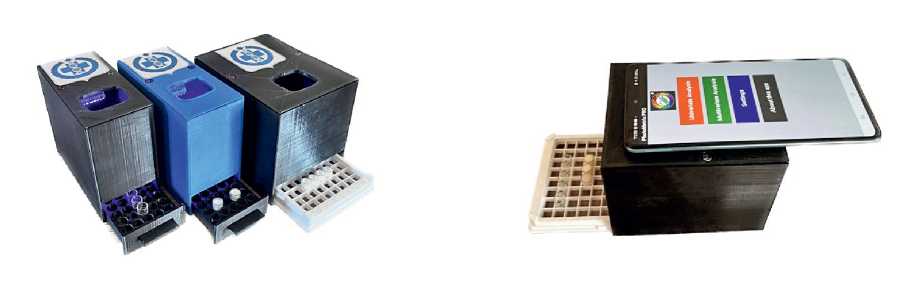 Устройства для анализа. Использовали устройства-боксы (9×12×9, 4×12×9 см), напечатанные на 3D-принтере, с установленной УФ-светодиодной матрицей SHL0020UV (390 нм) и блоком питания на 4.5 В (три элемента питания АА). Пробы размещали в стрипованных планшетах для иммуноферментного анализа с отламывающимися лунками из полистирола (SPL, Корея). Интенсивность флуоресценции регистрировали смартфоном Samsung SM-A715F с установленным приложением PhotoMetrix PRO® (рис. 1).