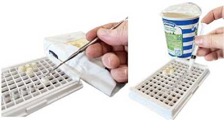 Пробоподготовка. Пробы для анализа приобретали в супермаркетах г. Владимира, Республике Ирак, а также использовали пробы, поступившие в рамках мониторинга во Всероссийский государственный Центр качества и стандартизации лекарственных средств для животных и кормов (ФГБУ «ВГНКИ»). Лунки планшета при анализе молока, кефира, сметаны заполняли с помощью медицинского шприца без иглы (емк. 2 мл) или с помощью медицинского шпателя при анализе творога и сливочного масла с выравниванием их поверхности (рис. 2).