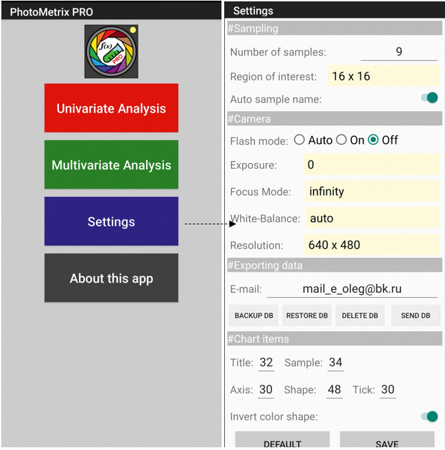 PhotoMetrix PRO®. Приложение для смартфонов PhotoMetrix PRO® на платформе Android предназначено для одномерного (зависимость аналитического сигнала от одного параметра) и многомерного (зависимость аналитического сигнала от многих параметров – цветовых каналов) цветометрического анализа различных объектов [24–27]. В данной работе рассматривали применение PhotoMetrix PRO® для анализа молочных продуктов.