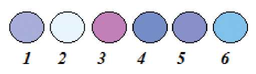 Рис. 4. Цвет флуоресценции жира свиного (1), маргарина (2), масла сливочного (3), жира бараньего (4), жира говяжьего (5), масла пальмового (6).