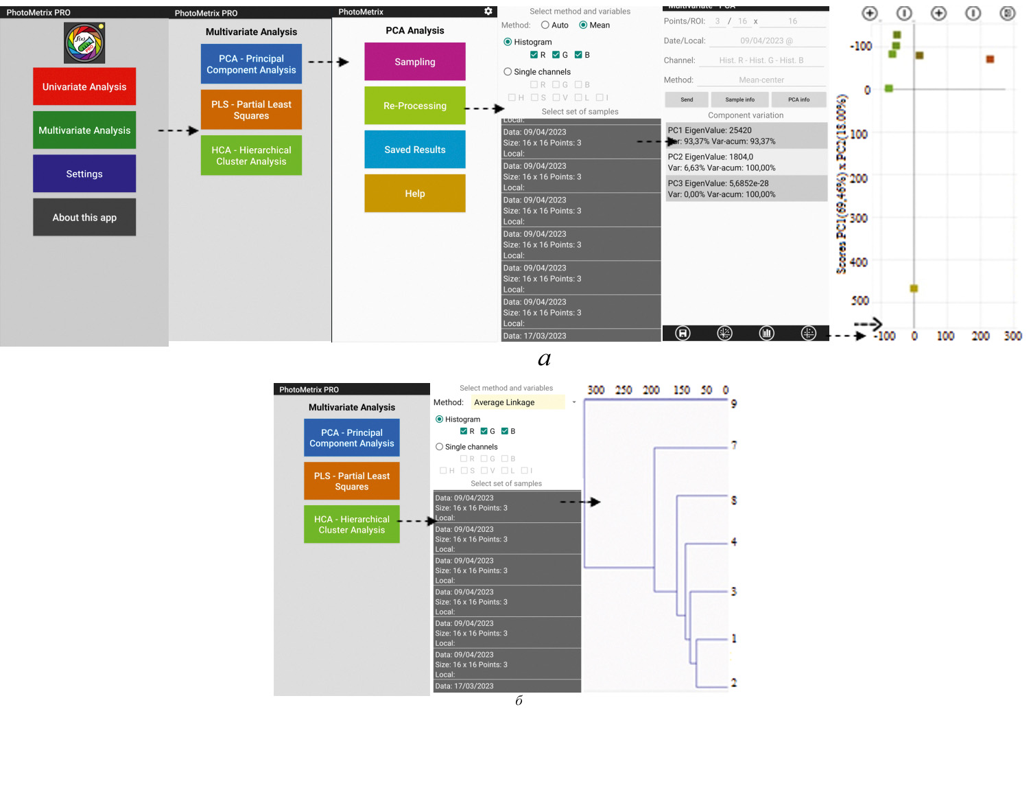 Рис. 5. Использование алгоритмов PCA (а) и HCA (б) в PhotoMetrix PRO при анализе молочных продуктов.