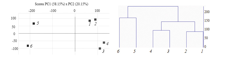 Рис. 6. График РСА и дендрограмма НСА. Масло сливочное: молочный завод “Суздальский” – 61.5% (1), 72.5% (2), 82.5 % (3); молочный завод “Судогодский” – 72.5% (4), маргарин “Хозяюшка” – 60% (5), растительно-сливочный продукт “Буренкин луг” – 72.5% (6).
