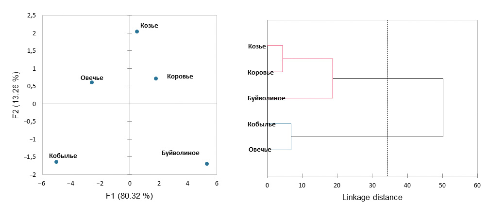 Рис. 7. График РСА для аутентификации молока (а) и дендрограмма HCA (б).