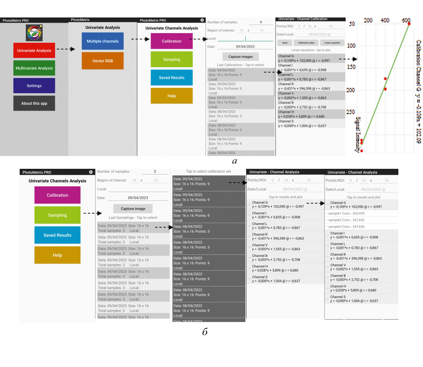 Рис. 9. Одномерный анализ в PhotoMetrix PRO. Получение градуировочной зависимости (а) и определение концентрации (б).