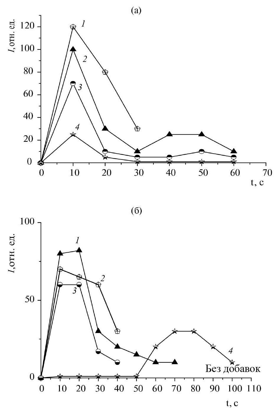 Рис. 2. Кривые испарения Ti (а) и Hf (б) из оксида алюминия в присутствии добавок: 1–15 мас. % ZnF2, 2–15 мас. % AlF3, 3–20 мас. % AgF и без добавок (4).
