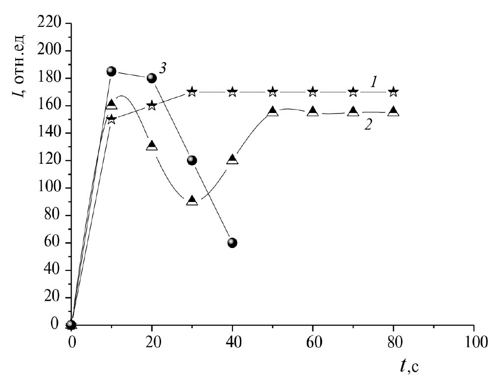 Рис. 3. Характер испарения элемента-основы алюминия из кратера электрода дуги без добавки (1) и в присутствии ZnF2 (2), а также элемента-примеси бора (3).