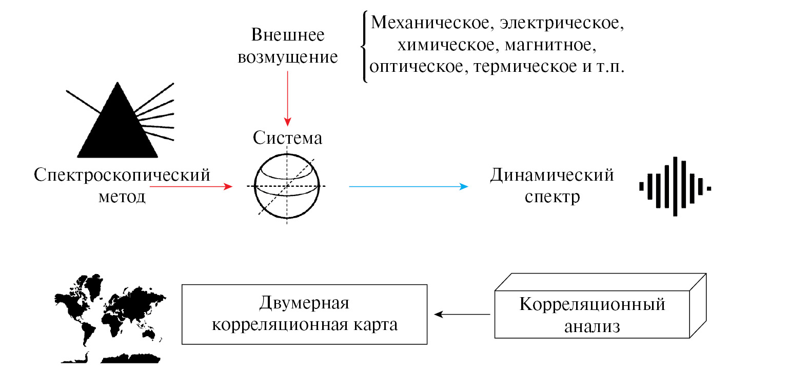 Внешнее возмущение. Применение 2D-COS основано на том, что используется дополнительное так называемое динамическое внешнее возмущение, т. е. фактор или группа факторов, влияющие на исследуемые соединения или процессы и проявляющиеся в результирующих спектрах. Когда к исследуемой системе прикладывается внешнее возмущение, селективно меняются (“возбуждаются”) различные составляющие системы. Процессы возбуждения и последующей релаксации к равновесному состоянию исследуемой системы контролируются спектроскопическими методами (ИК-, КР-спектроскопия и др.). На рис. 1 схематически показан базовый алгоритм обработки данных в 2D-COS, основанный на внешнем возмущении.