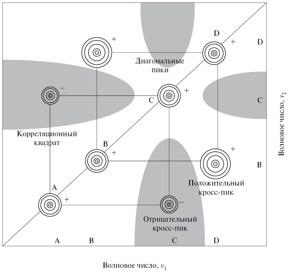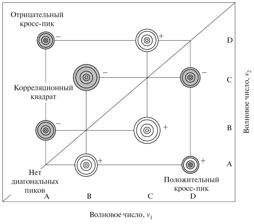 Корреляционные квадраты связывают автопики с соответствующими им кросс-пиками. Если кросс-пики, образующие корреляционный квадрат с автопиками, положительны, то спектральные полосы, генерируемые автопиками, одновременно увеличиваются. Если кросс-пики отрицательны, спектральные пики одновременно уменьшаются. На рис. 2 могут быть построены два отдельных корреляционных квадрата между A и C, B и D. Кросс-пики, связывающие A и C, являются отрицательными, поэтому A и C одновременно уменьшаются, тогда как кросс-пик, связывающий B и D, является положительным, что означает, что B и D одновременно увеличиваются [44]. Таким образом, корреляционный квадрат показывает существование синхронного изменения спектральных данных при этих спектральных переменных.