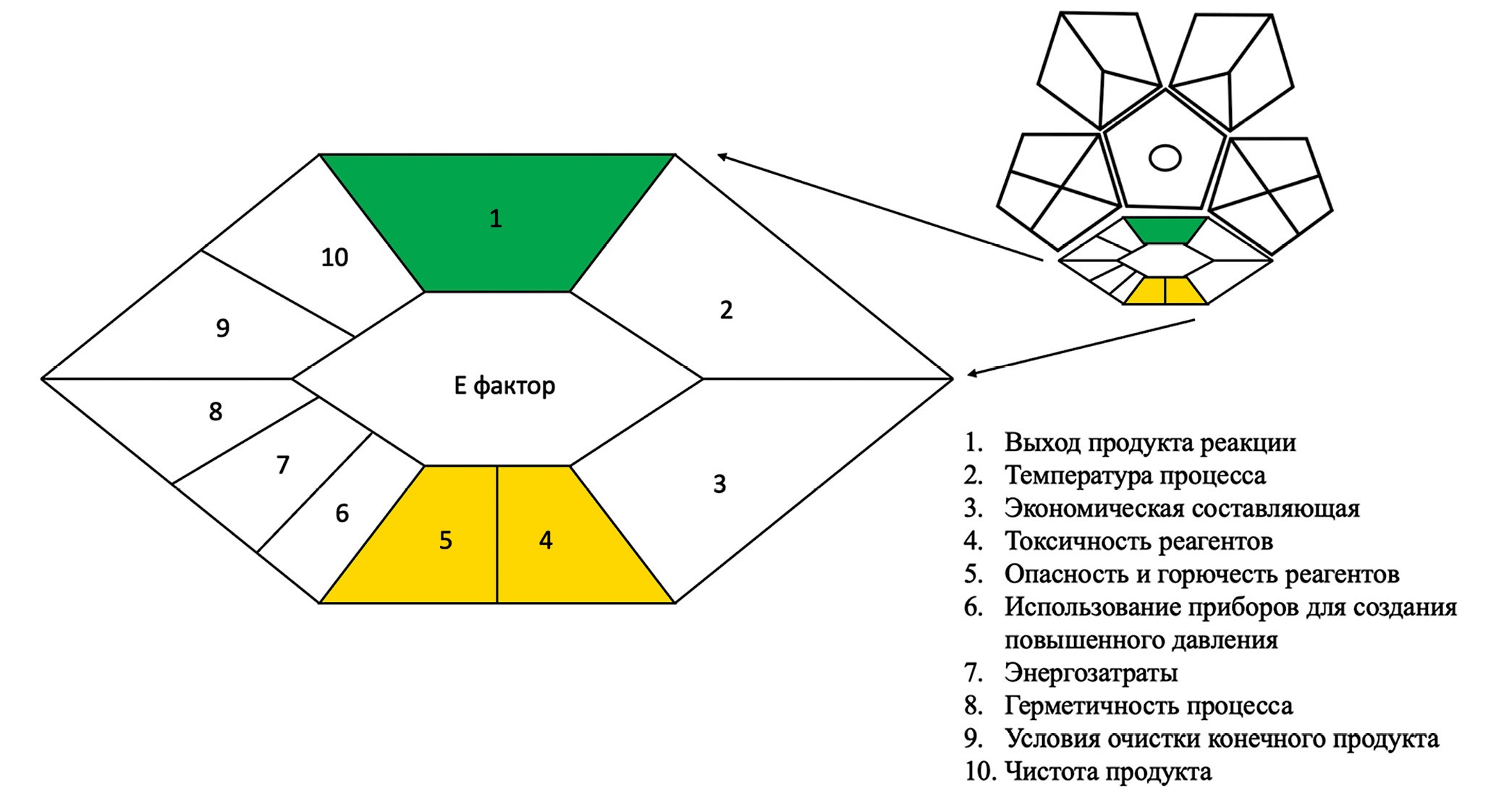 Комплексный индекс экологичности аналитических методик (Complementary green analytical procedure index, ComplexGAPI), 2021 г. Метод GAPI получил довольно большое распространение и уже часто используется химиками-аналитиками. В 2021 г. авторы данного метода предложили расширенную версию индекса, получившего название ComplexGAPI и имеющего дополнительный цветовой сектор под основной пиктограммой [19]. Комплексность метода подразумевает учет процессов, реализуемых до реализации самой аналитической методики. Например, процессы синтеза сорбентов, экстрагентов, вспомогательных материалов, наночастиц, а также других материалов, используемых на этапе разделения и концентрирования. Все это редко оценивается, так как большинство индексов ориентированы на оценку только параметров и расходов реагентов на этапе непосредственно выполнения химического анализа. В пиктограмме (рис. 8) отображаются 10 дополнительных секторов, которые отвечают соответственно за выход продукта реакции, температуру синтеза, экономическую составляющую, опасность и токсичность растворителей и реагентов, использование приборов для создания повышенного давления на этапе синтеза, энергозатраты приборов, герметичность процесса, условия очистки конечного продукта и его чистоту. Для каждого параметра предложены граничные условия для обозначения соответствующего сектора в зеленый, желтый или красный цвет. В центре данной пиктограммы указывают Е-фактор, равный отношению общего объема отходов к общей массе целевого продукта. Данный фактор учитывает не только побочные отходы и остаточные реагенты, но и отработанные катализаторы, носители катализаторов, потери растворителей и все остальное, что можно рассматривать, как отходы.
