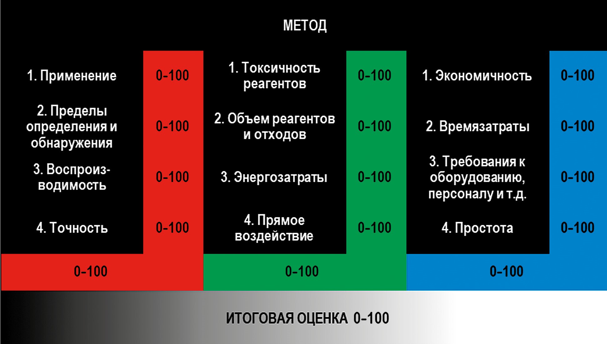 Такие методы анализа, как ИК-спектроскопия и иммуноферментный анализ являются неэнергозатратными и не имеют штрафных баллов. При использовании атомной абсорбции или газовой хроматографии начисляется 1 штрафной балл, методов ядерного магнитного резонанса или рентгеновских методов – 2 балла. Также авторы описывают порядок оценки расхода и опасности реагентов. Если используется менее 10 мл или г реагента, то начисляется 1 штрафной балл, но если это токсичный реагент, то количество баллов умножается на его класс опасности. Таким образом, в соответствии с данной шкалой более экологично использование большого объема менее опасного реагента. Если при выполнении анализа в воздух выделяются какие-либо газы или пары, присваивается 3 штрафных балла. Однако, если аналитический процесс изолирован, штрафные баллы не начисляются. Разработан достаточно подробный алгоритм для расчета штрафных баллов по всем параметрам с конкретными примерами [14]. Оценка выше 75 характеризует методику как “отличную”. Оценка в диапазоне 50–75 отвечает “приемлемой” методике. Оценка менее 50 считается “неудовлетворительной”.