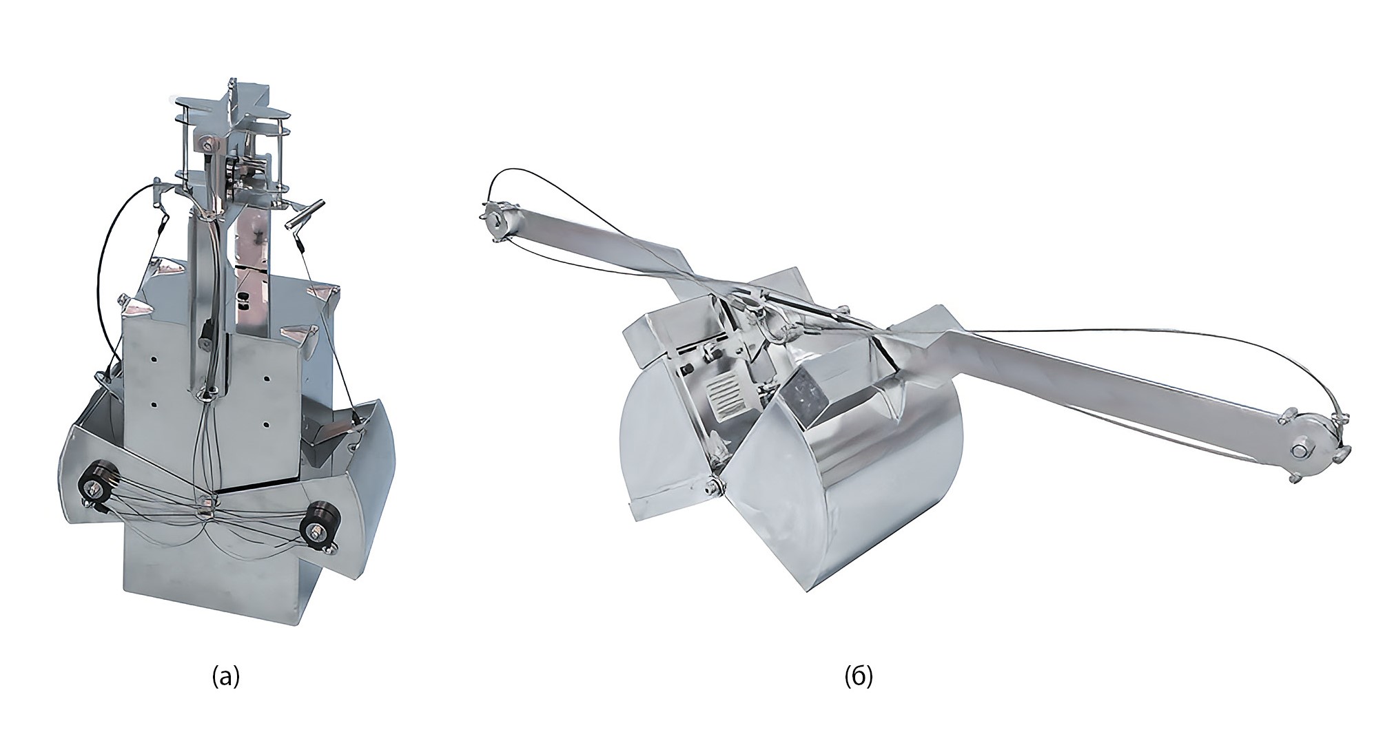 Рис. 3. Фотографии бокскорера (а) и грейферного ковша (б) для отбора донных отложений.