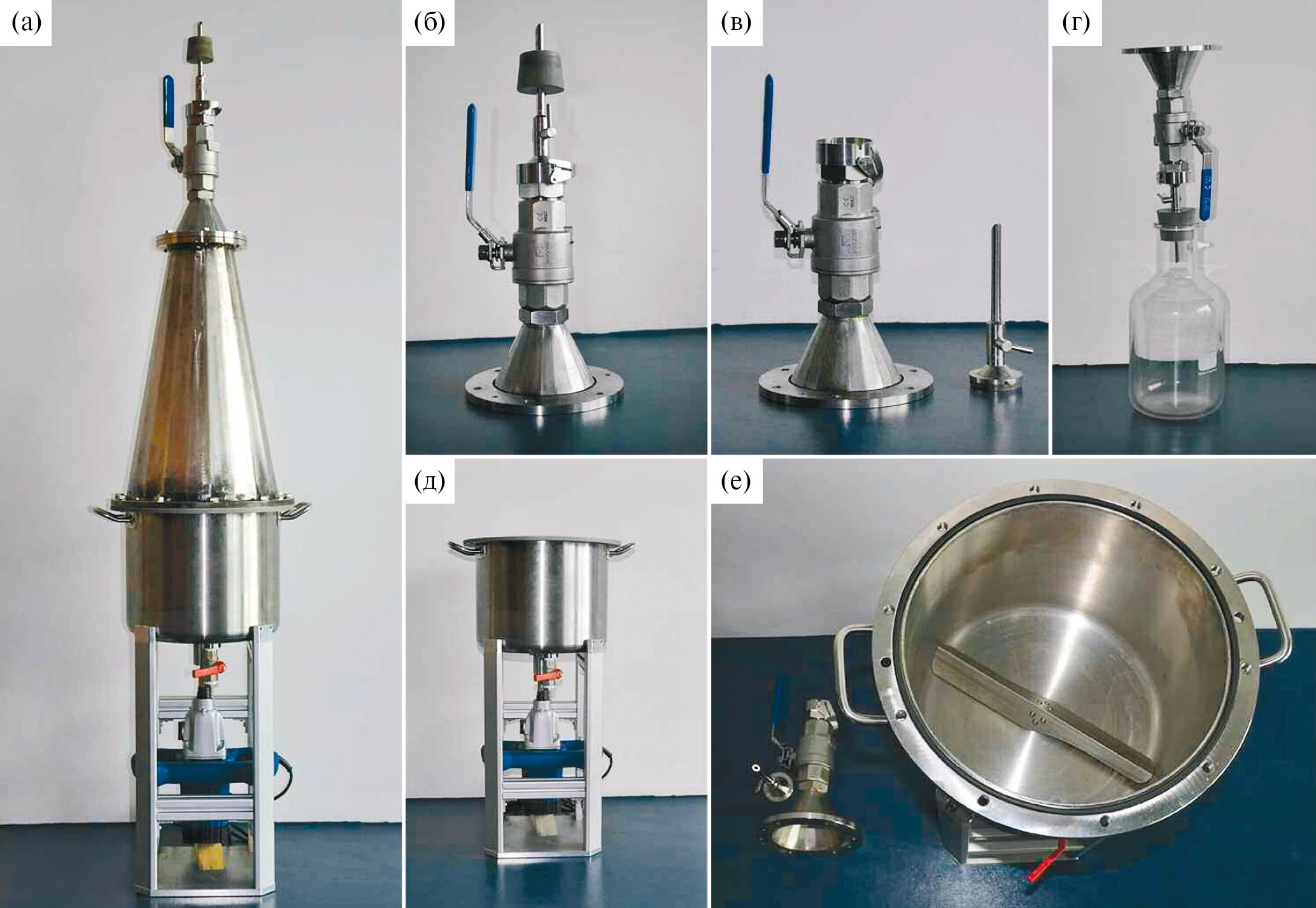 Рис. 5. Фото сепаратора микропластика из донных отложений MPSS. (а) Сепаратор, состоящий из двигателя, приводящего в движение мешалку, контейнера для донных отложений, конической колонны и разделительной камеры со встроенным фильтродержателем и камерой для образца; (б) разделительная камера с установленным фильтродержателем; (в) разделительная камера с отсоединенным фильтродержателем; (г) разделительная камера в режиме фильтрации; (д) стойка, контейнер для донных отложений и двигатель; (е) контейнер для донных отложений с мешалкой.