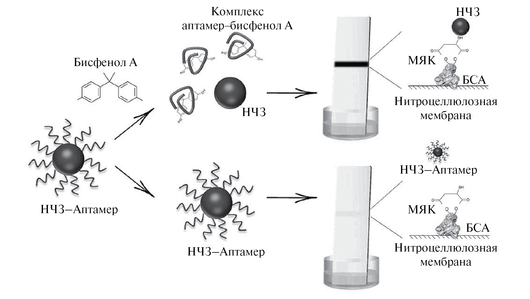Рис. 1. Схема мембранной хроматографической тест-системы с использованием аптамера для определения бисфенола А.