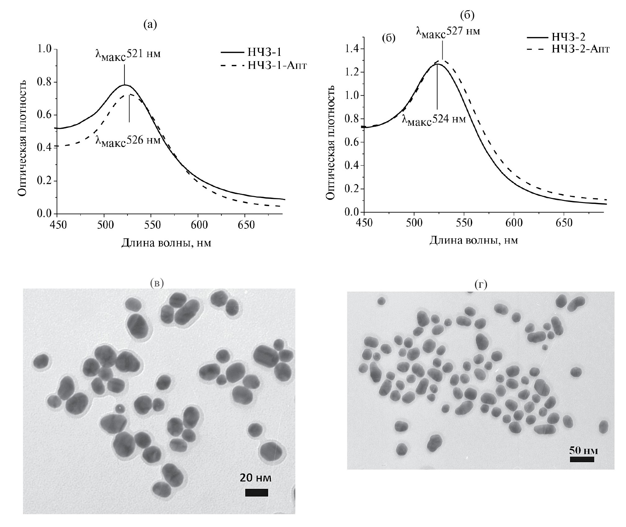 Рис. 3. Спектры поглощения (а) НЧЗ-1 и (б) НЧЗ-2 до (сплошная линия) и после (пунктирная линия) конъюгирования с аптамером. Электронно-микроскопические изображения (в) НЧЗ-1-Апт и (г) НЧЗ-2-Апт.