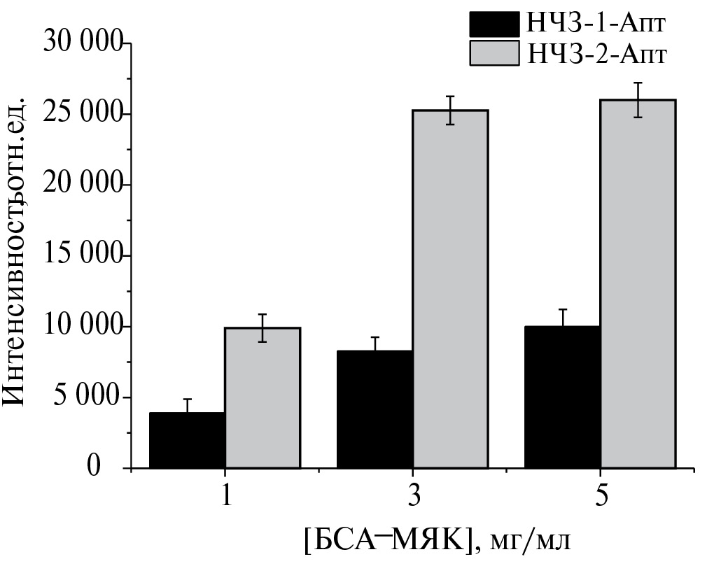 Меркаптоянтарную кислоту выбрали в качестве детектирующего вещества вследствие прочного связывания ее тиольных групп с поверхностью золота [36] и конъюгировали с белком-носителем БСА для формирования тестовой зоны. Концентрацию конъюгата БСА–МЯК, адсорбируемого на мембране, варьировали от 1 до 5 мг/мл. Препараты НЧЗ-1-Апт и НЧЗ-2-Апт смешивали с образцом, содержащим 30 мкг/мл бисфенола А, инкубировали и пропускали по тест-полоске. Как видно из рис. 5, тестовые зоны, полученные при использовании 3 и 5 мг/мл БСА–МЯК, генерируют близкую и довольно высокую интенсивность окрашивания. Исходя из этих результатов, в качестве оптимальной для обоих конъюгатов выбрали концентрацию 3 мг/мл.