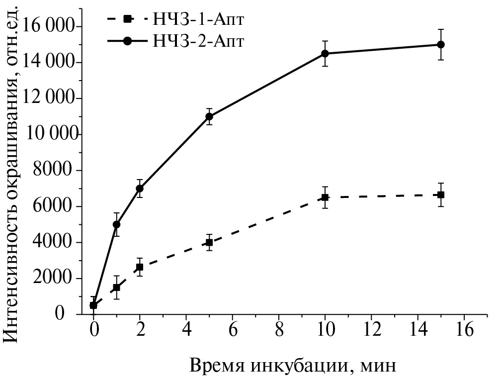 Синтез наночастиц золота, модифицированных аптамером ([32] с изменениями). Для конъюгирования с НЧЗ использовали SH-модифицированный аптамер, активацию которого проводили следующим образом: исходный раствор аптамера разбавляли до концентрации 20 мкМ в 10 мМ фосфатном буферном растворе (рН 7.4), после чего нагревали до 95 оC, инкубировали в течение 5 мин и охлаждали до комнатной температуры. Для активации тиольных групп к 90 мкл 20 мкМ раствора аптамера добавляли 4.5 мкл 20 мМ раствора трис(2-карбо- ксиэтил)фосфина и инкубировали в течение 1 ч при комнатной температуре и перемешивании. Перед конъюгацией НЧЗ с аптамером значение рН доводили до 8.5 добавлением 0.2 М раствора K2CO3 и концентрировали до оптической плотности (ОП) 7.5 при 525 нм. Далее к 30 мкл активированного аптамера добавляли по 400 мкл концентрированных растворов НЧЗ-1 и НЧЗ-2 и инкубировали в течение 16 ч при комнатной температуре. После инкубации к растворам конъюгатов добавляли 1 М раствор NaCl по 4 мкл каждые 20 мин до конечной концентрации 70 мМ и оставляли растворы на 24 ч при 4 оC. Избыток тиолированного аптамера удаляли, отбирая супернатант после центрифугирования при 6800g в течение 10 мин, а конъюгаты НЧЗ-1-Апт и НЧЗ-2-Апт повторно растворяли в 10 мМ фосфатном буферном растворе (pH 7.4), содержащем 1% сахарозы, 1% БСА и 0.25% Твин-20. Полученные препараты конъюгатов НЧЗ-1-Апт и НЧЗ-2-Апт хранили при 4 оC.