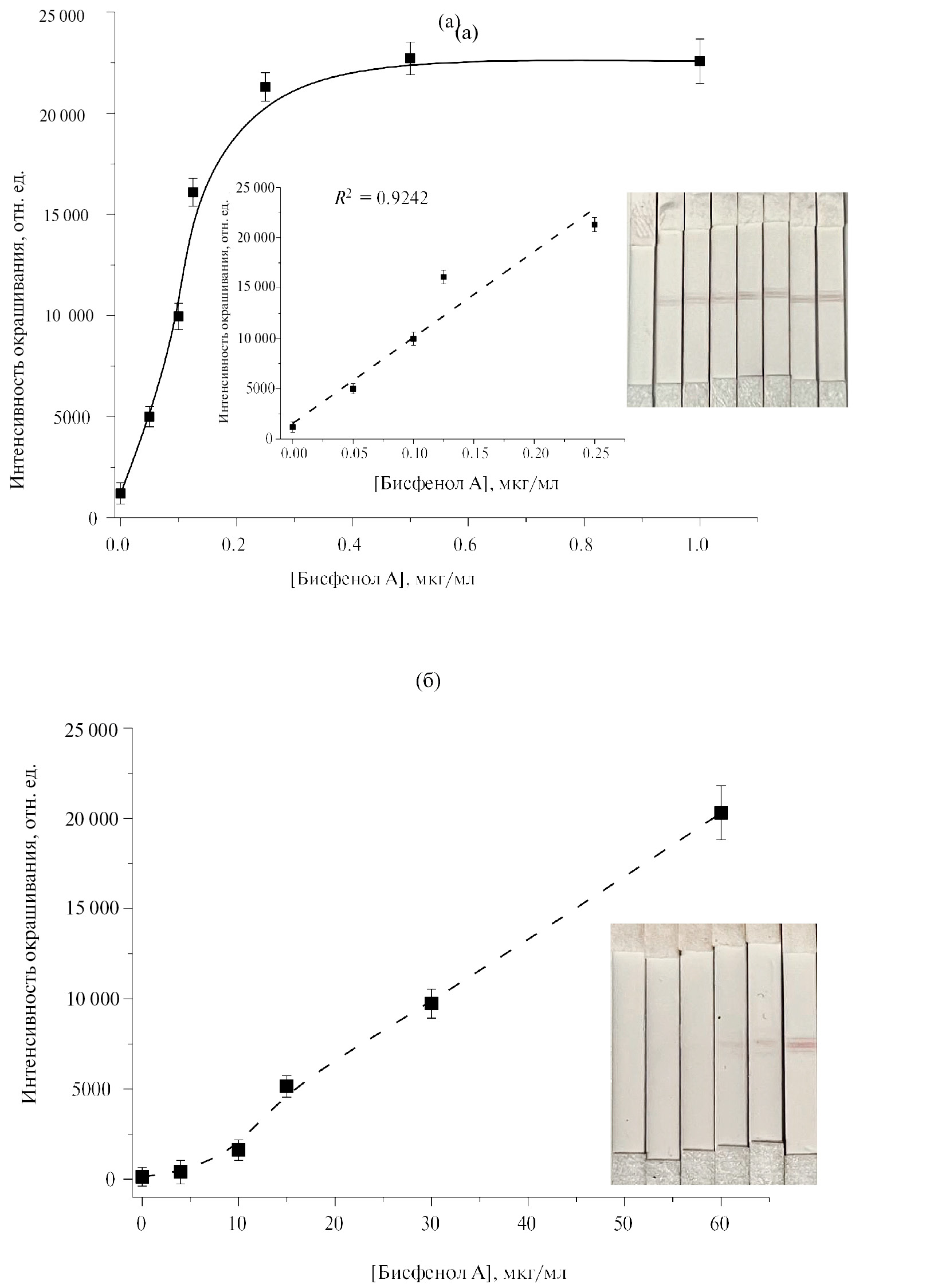 Рис. 7. Зависимости интенсивности окрашивания тестовой зоны от концентрации бисфенола А для (а) НЧЗ-1-Апт и (б) НЧЗ-2-Апт. Вставка: цифровые изображения тест-полосок при разных концентрациях бисфенола А. Условия эксперимента: бычий сывороточный альбумин−меркаптоянтарная кислота 3 мг/мл, 100 мкл смеси метанол−вода (1:4), 2 мкл раствора НЧЗ-Aпт, время инкубации 10 мин.