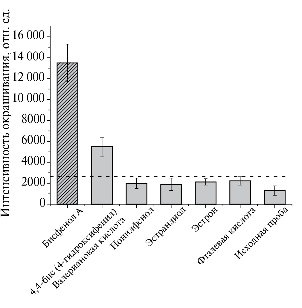 Рис. 8. Селективность определения бисфенола А в сравнении с другими веществами, негативно воздействующими на репродуктивную систему, – интенсивности окрашивания тестовой зоны при тестировании растворов с концентрацией 1 мкг/мл. Пунктирной линией обозначена граница наблюдения невооруженным глазом окрашивания тестовой линии.