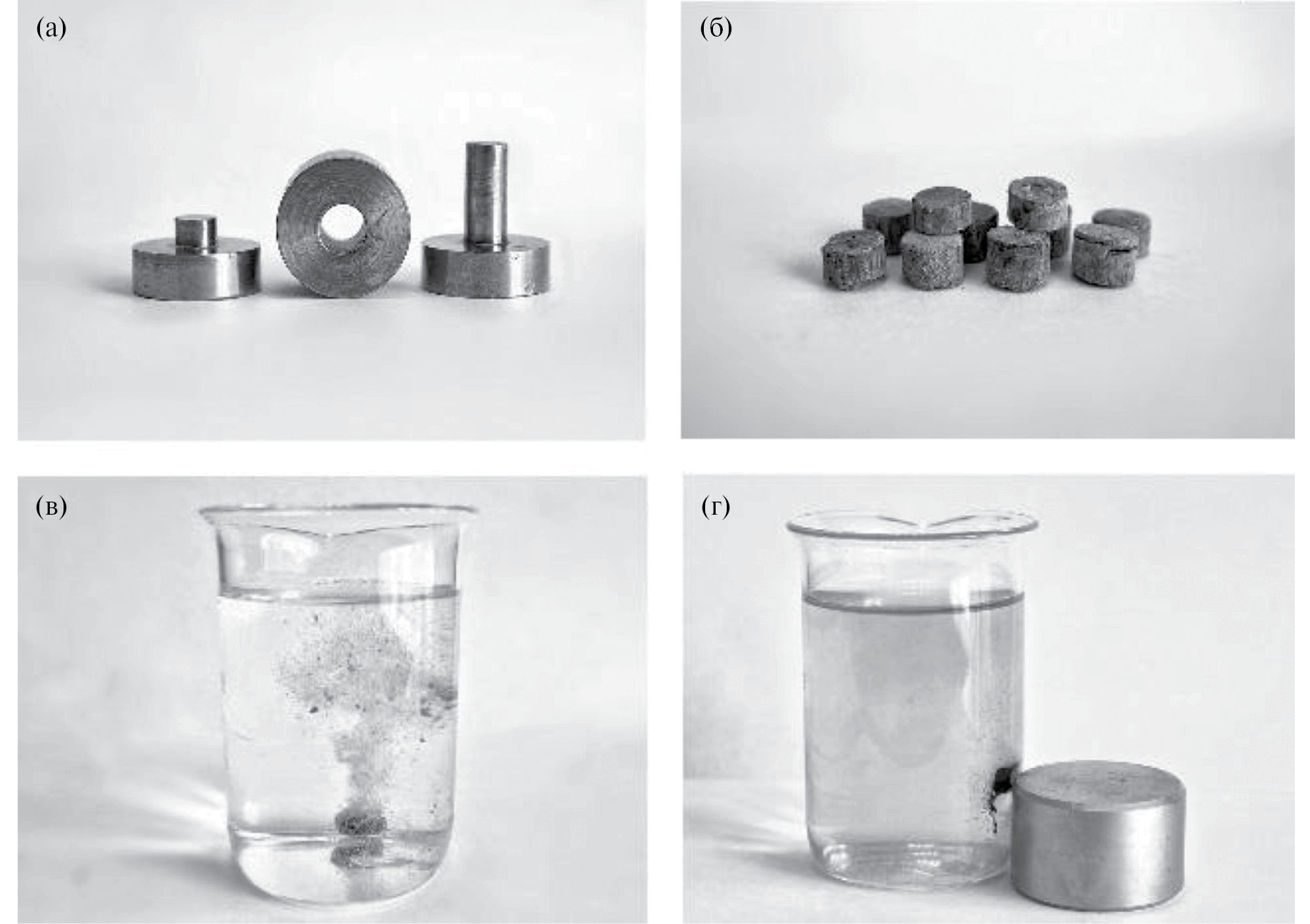 Рис. 1. Приготовление и применение шипучих таблеток для сорбции дихлорфеноксикарбоновых кислот и хлорфенолов: (а) формы для прессования таблеток, (б) внешний вид таблеток на основе Fe3O4/C, (в) растворение и перемешивание за счет выделения СО, (г) извлечение Fe3O4/C неодимовым магнитом после сорбционного концентрирования.