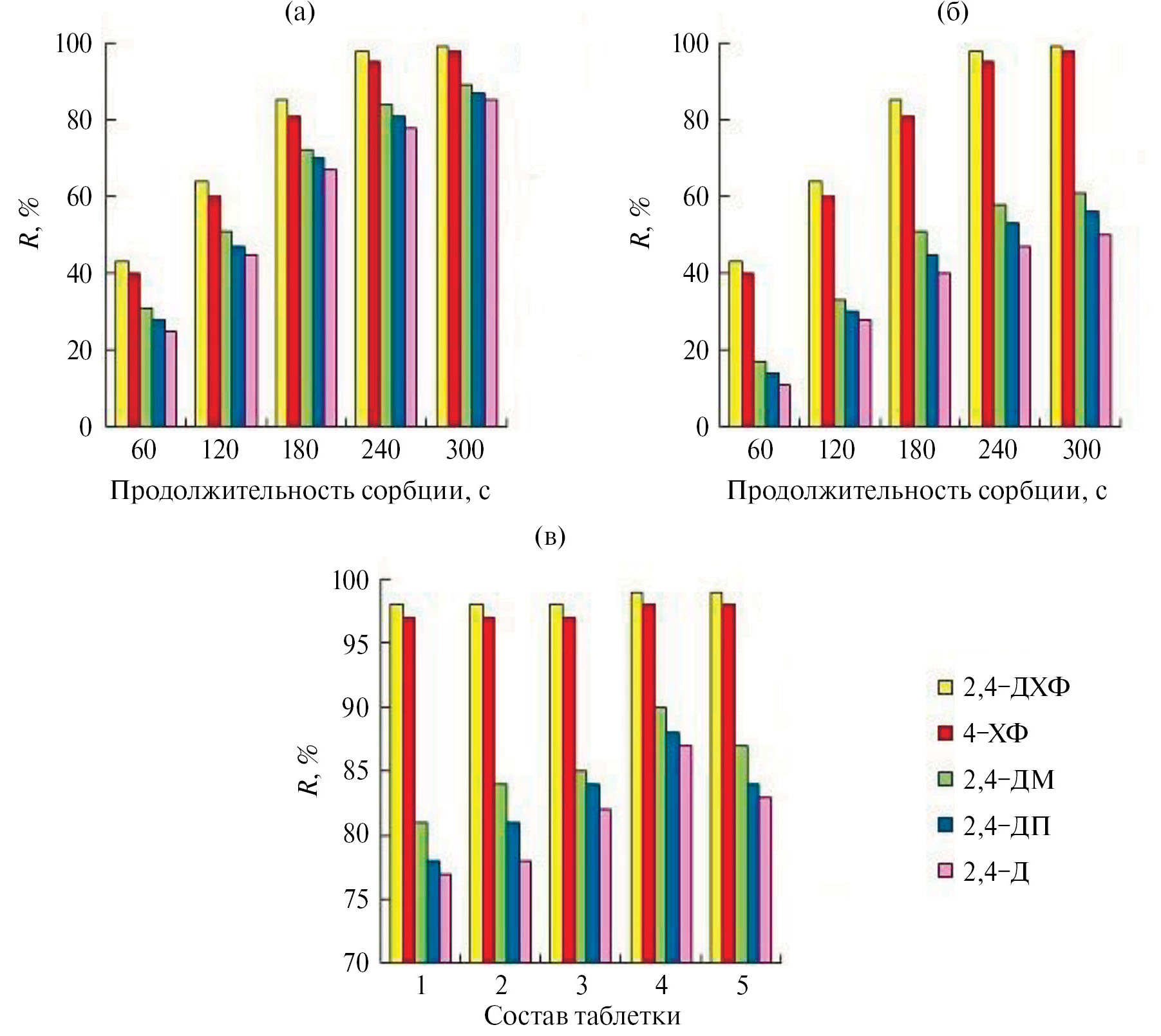 Наиболее эффективна сорбция при применении ШТ состава № 4 (табл. 2). Соответствующее соотношение компонентов обеспечивает наилучшее сочетание продолжительности выделения углекислого газа (296 с, что приблизительно соответствует ранее установленному времени достижения равновесия [36]), и достижение реакции среды с рН 3.52. Таблетка, при растворении которой реакция среды оказывается более кислой (состав № 5), характеризуется меньшим временем выделения газа, что влияет на сорбционные характеристики – степени извлечения ДХФ снижаются на 2–3%. Составы № 1–3, обеспечивающие более длительное выделение СО2, характеризуются более высоким значением рН. В результате происходит менее интенсивное выделение СО2. В дополнение к этому менее кислая среда способствует более полной ионизации и повышению растворимости ДХФК. Оба фактора приводят к снижению извлечения на 3–9%. На сорбцию ХФ изменение состава таблеток существенно не влияет, разница в степенях извлечения не превышает 1–2% (рис. 2в).