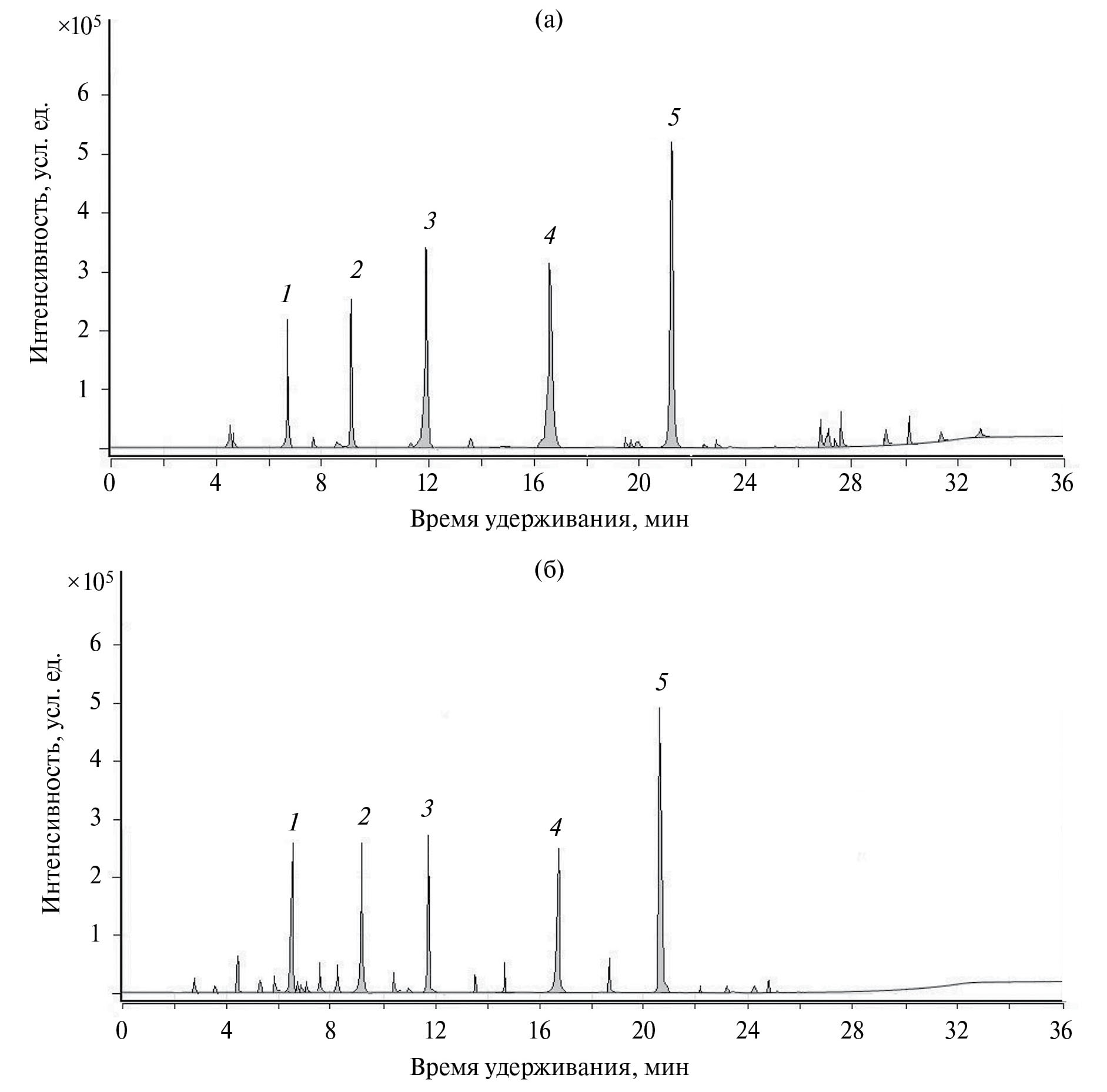 Рис. 4. Хроматограмма модельного образца (а) речной воды и (б) почвы, загрязненных дихлорфеноксикарбоновыми кислотами и хлорфенолами. Идентификация пиков: 1 – 4-ХФ; 2 –2,4-ДХФ; 3 – 2,4-Д; 4 – 2,4-ДП; 5 – 2,4-ДМ.