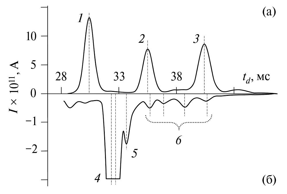 Эксперименты показали, что при регистрации исследуемых ВВ наличие в пробе ПЖО существенно не влияло на качественный состав ионов ТАТП или НА, однако вызывало появление новых пиков ГМТД. На рис. 1 представлены фрагменты положительного и отрицательного спектров подвижности при анализе отпечатка пальца, содержащего 1 мкг ГМТД. В положительной моде время дрейфа доминирующих ионов ПЖО отпечатка пальца td = 30.42 мс (пик 1) полностью совпадало с td ионов мочевины, а в отрицательной моде времена дрейфа доминирующих ионов ПЖО отпечатка пальца td = 32.26 мс и td = 32.80 мс (пики 4) полностью совпадали с td ионов молочной кислоты. Пик (3) соответствует аддукт-катиону, так как последний образуется при наличии в пробе ГМТД и мочевины или ПЖО, а пик (5) – аддукт-аниону ГМТД, для образования которого необходимо наличие в пробе ГМТД и МК или ПЖО.
