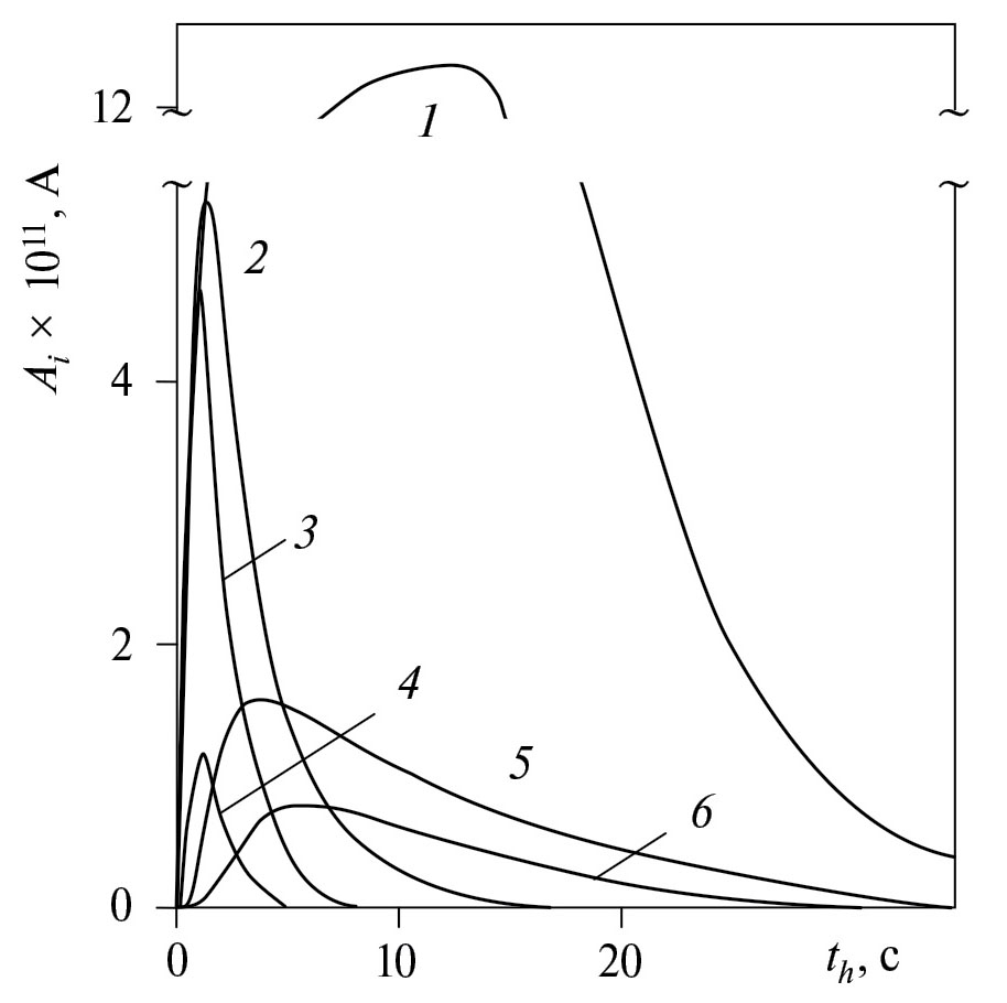 Из рис. 2 видно, что проба mГМТД = 10 нг (2) малолетучего ГМТД при введении салфетки в термодесорбер, в котором поддерживается температура 180 °С, полностью испаряется с ее поверхности, проходит входной тракт ИДД и покидает камеру ионизации примерно за th = 15 с. Максимум наблюдается при t ≈ 1.2 с. При анализе mГМТД = 1 мкг (кривая 1) в диапазоне th ≈ 5–13 с амплитуда пика находится в насыщении AГМТД ≈ 120 пА, при th > 13 с интенсивно спадает, но даже при th = 35 с она остается достаточно большой – AГМТД ≈ 5 пА. Пик ионов летучего ТАТП при массе пробы mТАТП =10 мкг полностью исчезает примерно за 8 с при максимуме th ≈ 1 с. Наличие в пробе отпечатка пальца с обильными ПЖО практически не влияет на динамику испарения летучего ТАТП (сравнение кривых 3 и 4), в то время как для малолетучих НА и ГМТД наблюдается более пологий спад амплитуды Ai (th).