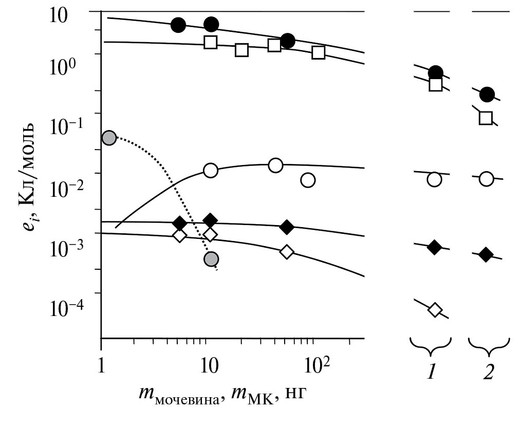 Рис. 3. Зависимости ei (mмочевина) в положительной моде для ионов с K0, см2/(В · с): черный круг – K0 ГМТД = 1.50, черный ромб – K0 ТАТП = 2.05, белый ромб – K0 ТАТП = 1.33. Зависимости ei (mМК) в отрицательной моде для ионов: белый круг – K0 ГМТД = 1.48, серый круг – K0 ГМТД = 1.91, белый квадрат – K0 НА = 2.01. 1 – среднестатистические потожировые отложения + взрывчатое вещество, 2 – обильные потожировые отложения + взрывчатое вещество.