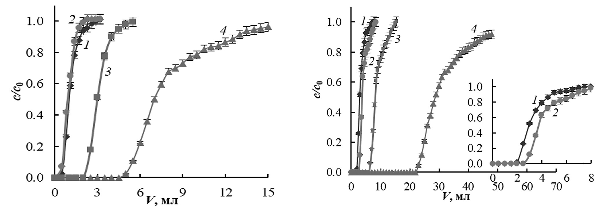 Степень извлечения R рассчитывали как отношение количества вещества, удерживаемого слоем сорбента n, к общему количеству вещества пропущенного компонента n0: