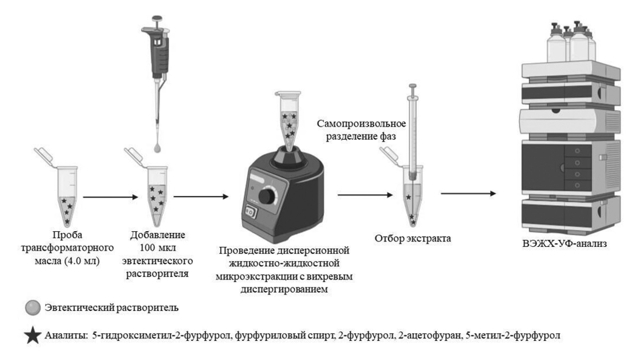 Таким образом, разработан способ определения фурановых производных в трансформаторном масле (рис. 4). В полимерную пробирку помещают 4.0 мл пробы трансформаторного масла, добавляют 100 мкл ЭР на основе уксусной кислоты и холин хлорида (1 : 1, моль/моль) с содержанием воды 20 % и перемешивают с использованием вихревого диспергатора в течение 1 мин. После самопроизвольного разделения фаз (1–2 мин в зависимости от вязкости трансформаторного масла) отбирают 50 мкл фазы экстракта при помощи хроматографического шприца для последующего определения фурановых производных методом ВЭЖХ-УФ.