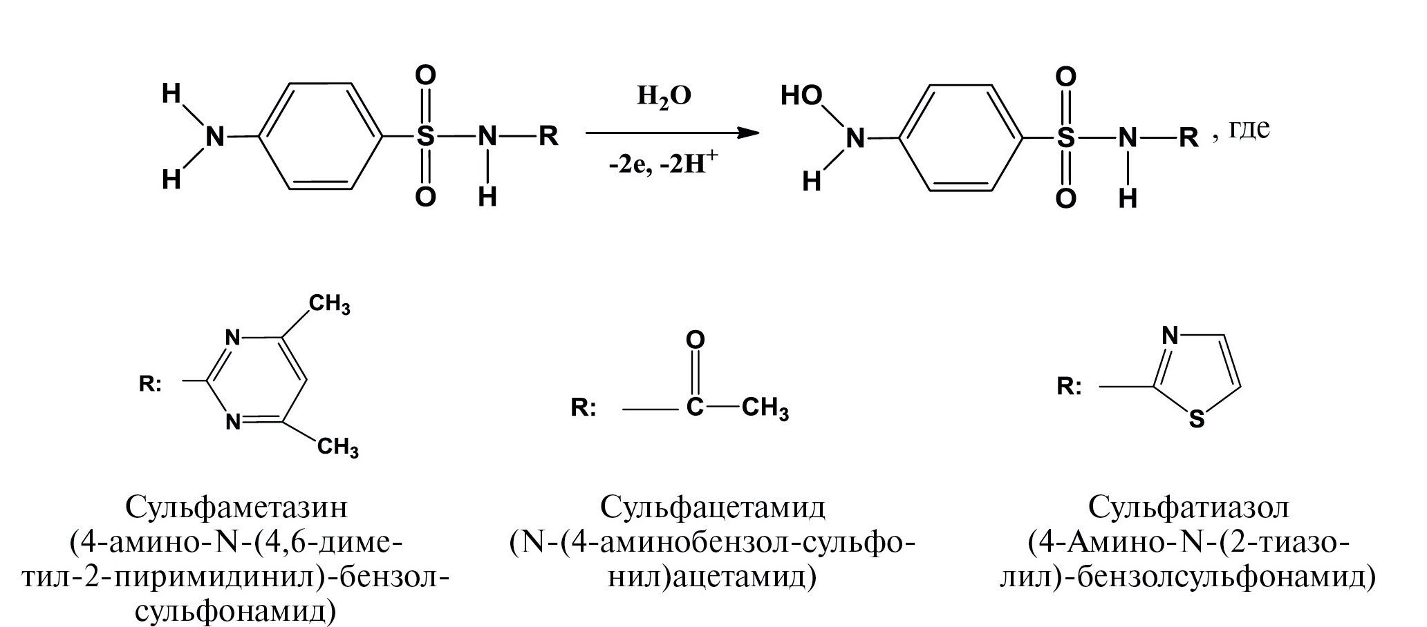 Сульфаниламиды, к которым относятся сульфаметазин, сульфацетамид и сульфатиазол – синтетические химиотерапевтические средства широкого спектра действия. При электроокислении рассматриваемых сульфаниламидов на немодифицированном СУЭ наблюдаются плохо выраженные пики при достаточно высоких анодных потенциалах (Е > 1.20 В). Реакция предположительно протекает по схеме 1 [19].