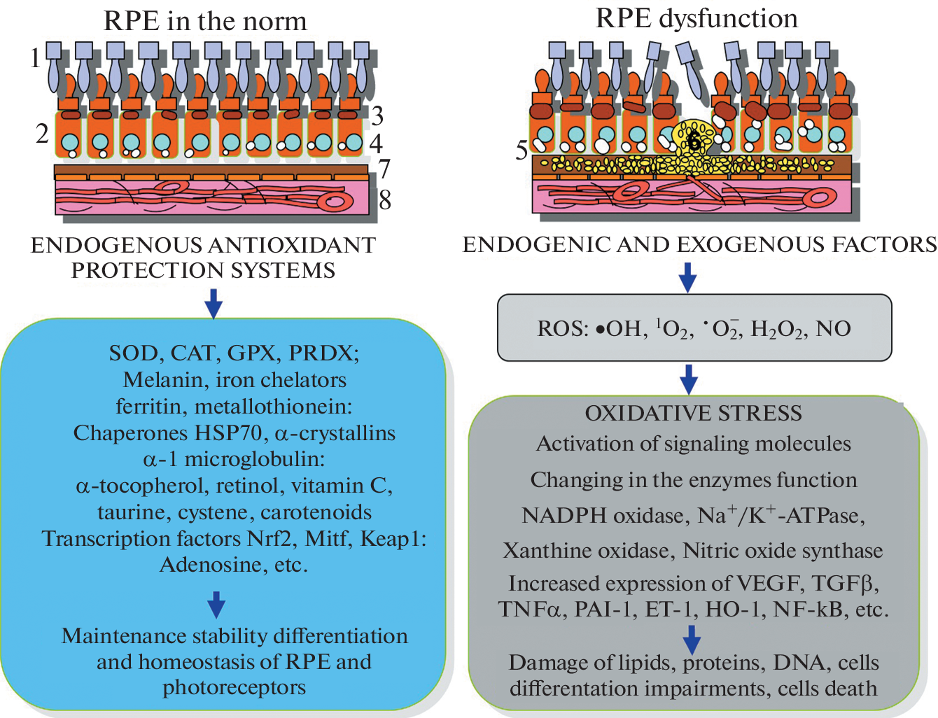 In the course of evolution and adaptation to life conditions, organisms have developed the strategies that allow to use of the reactive oxygen species (ROS) in regulation of physiological processes and in maintenance of homeostasis. Retinal pigment epithelium (RPE) is one of the prime examples of tissues with a high level of metabolism and intracellular ROS, that have the more risk of damage after oxidative stress (OS), under the influence of exogenous or endogenous stress factors. Vertebrate RPE cells, despite the conservatism of the eye tissue structures and their main functions, respond differently to OS are due to the taхon-species specificity of the components of signaling pathways that form the antioxidant defense system (AODS). Transcription factors, in particular, Nrf2 play a key role in AODS. AODS in RPE includes the several levels of regulation, interaction of which ensures the stability of morphofunctional state of the cells. Phylogenetic analysis of the key components of AODS in various vertebrates revealed not only conservation, but also variability in the protein domain organization. This may reflect the differences in functions, adaptability and regenerative potential. The identification of AODS mechanisms that ensure the morphofunctional stability of RPE cells is of fundamental importance and is aimed at finding tissue-specific targets for effective treatment of a spectrum of eye diseases.