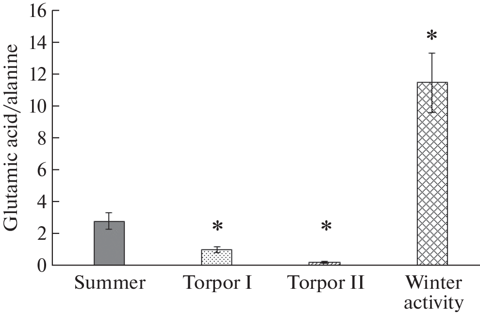 The state of hibernation is characterized by increased resistance to the effects of prolonged deep hypothermia, hypoxia, lack of food and water. At the same time, the restructuring of the adaptive mechanisms of animals at low temperatures, even for a short time, causes significant changes in metabolism, reflected in the pattern of amino acids. The change in the metabolism of free myocardial amino acids during hibernation has not yet been studied by anyone, but the idea of it is necessary to understand the mechanisms of the hibernation state, which is relevant for clinical medicine. In this regard, the task of this work was to study the changes in the composition of free amino acids of the myocardium of the ground squirrel U. undulatus at different stages of hibernation. A negative interdependence of glutamic acid and alanine pools at different stages of torpor was revealed. The decrease in the level of glutamic acid compared to the summer control (5.08 ± 0.44 μmolе/g wet weight) began in the first, December bout, continued with prolonged torpor (up to 1.57 ± 0.14 μmolе/g) and was accompanied by a corresponding increase in the alanine pool. During the winter awakening, the glutamic acid pool rose above the summer level; The pool of alanine fell below the summer level, but their total level did not change. The pools of aspartic acid and glycine decreased in parallel with the decrease in pools of glutamate and aspartate, but during the winter awakening, glycine was not even detected. Taking into account the participation of glutamic acid and aspartate in the anaplerotic reactions of the Krebs cycle and the reciprocal relationship of glutamic acid and alanine, it is concluded that the change in the content of these metabolites at different stages of bouts is associated with a gradual transition of aerobic glycolysis (Krebs cycle and oxidative phosphorylation) to anaerobic, and during euthermia, on the contrary, with a return to aerobic.