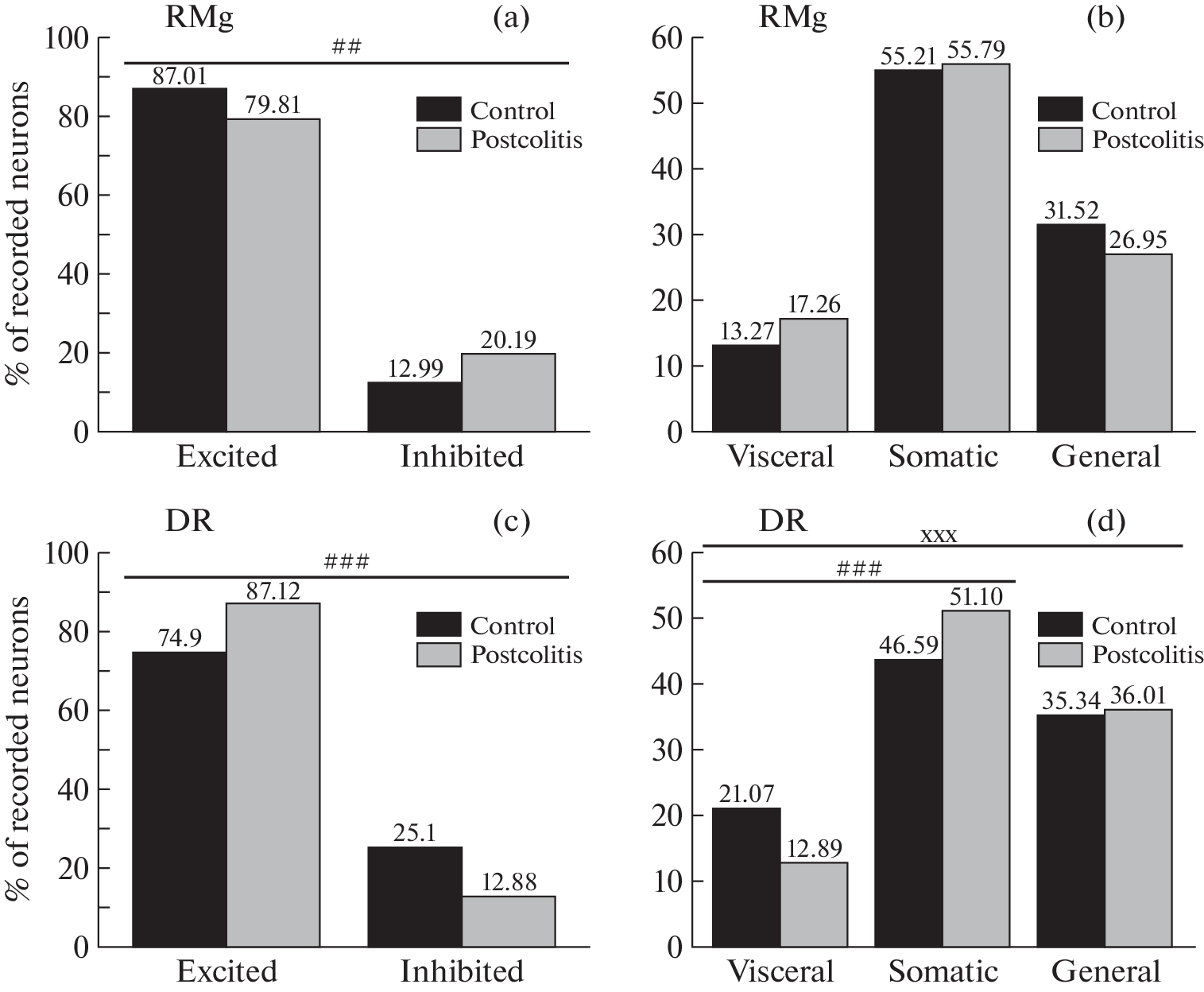 Dysfunction of the brain serotonergic system is thought to play a leading role in the pathogenesis of chronic abdominal pain and comorbid somatic hyperalgesia, which disturb a significant proportion of patients with digestive tract diseases, even in remission. However, the specific changes in the serotonergic structures nociceptive properties that can be initiated by organic pathology and persist after its resolution remain unclear. The aim of our neurophysiological study on anesthetized rats – healthy and recovered from colitis – was to identify the alterations in the raphe magnus (RMg) and dorsal raphe (DR) nuclei neuronal responses to visceral (colorectal distension) and somatic (squeezing of the tail) noxious stimulations that persist after resolution of intestinal inflammation. It has been shown that both nuclei contain different groups of nociceptive neurons: 1) responding with activation only to colorectal distension (visceral); 2) excited only by tail squeezing (somatic); 3) reacting with excitation to the both irritations (general); 4) responding with discharge inhibition to any of the stimulations (inhibited). Compared with healthy animals, in RMg of colitis-exposed rats the number of the inhibited cells was increased and the total proportion of excited nociceptive neurons was reduced. Distension of the inflammation-undergone intestine caused enhanced RMg neuronal inhibition, whereas squeezing of the pathology-unaffected tail led to increased excitation of the RMg selective somatic and general nociceptive cells. In turn, in the DR of postcolitis rats the inhibited neuron proportion was reduced, while the increased population of excited neurons included fewer visceral and more somatic selective cells. This was accompanied by an increase in the selective reactions of the latter to somatic pain stimuli and by an increase in non-selective DR neuron excitation by visceral and somatic pain signals. The identified neuronal alterations can contribute to the postcolitis impairment of the studied raphe nuclei functions in the endogenous control of visceral and somatic pain sensitivity.